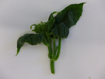 Scalding of the shoot apex, a physiological problem caused by high RH, too little light, and Ca deficiency (cucumber)