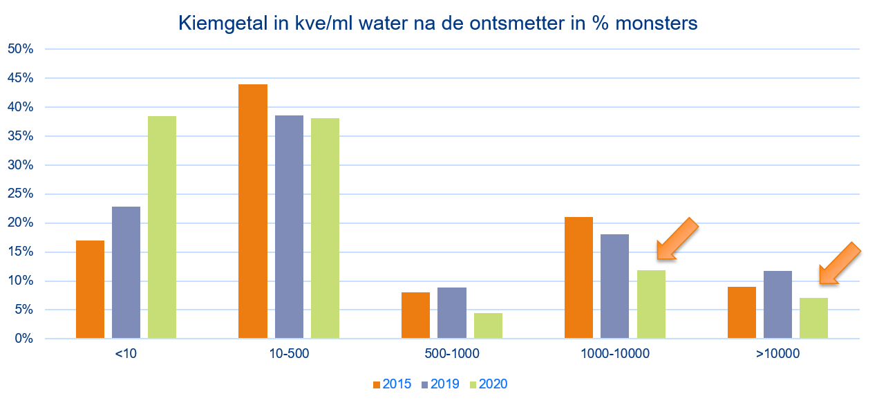 Eurofins Agro has summarised the results of five years of research (figure 1). This shows that in 2020, one in five samples was still exceeding the Eurofins Agro target value of <500 CFU/ml. These colonies can contain harmful organisms. "This is not what you want, of course,” Hardeman says. According to him, there are various possible causes for this less-than-optimal pathogen elimination: