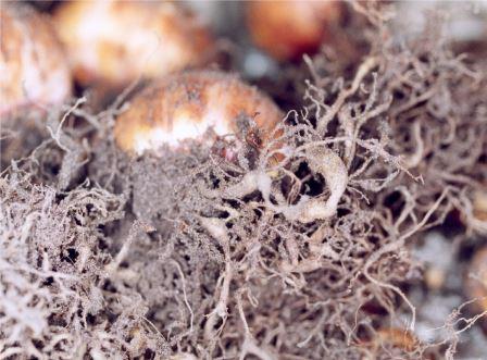 Foto 3: M. chitwoodi/fallax in wortels van gladiool. Bron: aaltjesschema.nl