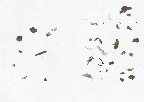 - Analyse van het oppervlakte van alleen van de plastic verontreinigingen. Ook hiervan wordt het resultaat in cm2 per liter en met een foto weergegeven.